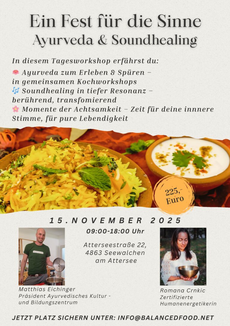 Eine herzliche Einladung zum Ayurveda & Soundhealing Tagesevent ‚Ein Fest für die Sinne‘ mit der lieben Romana in Seewalchen am Attersee am 15. November 2025.